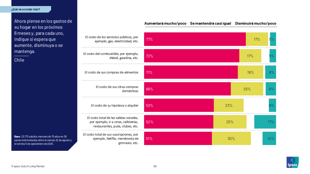 Al preguntar sobre los gastos de los hogares en Chile, más de siete de cada 10 encuestados del país creen que en los próximos seis meses aumentará el costo de los servicios públicos (77%), del combustible (72%) y de sus compras de alimentos (71%). Además, dos de cada tres (66%) pronostica que aumentará el costo de sus otras compras domésticas; y una mayoría cree que aumentará el valor de su hipoteca o arriendo (53%), de sus salidas sociales (52%) y de sus suscripciones (51%).