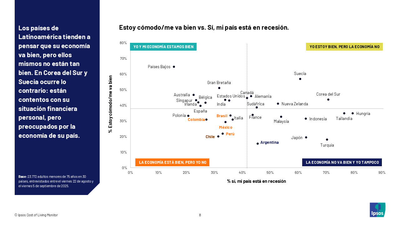 “Con la excepción de Argentina, que tiene asumidas sus dificultades económicas como una condición crónica, los países de América Latina se distinguen por un mayor optimismo respecto a sus finanzas personales para el próximo año. En cada uno de ellos son más los encuestados que esperan que aumente su estándar de vida e ingresos disponibles para 2026 que los que piensan que disminuirá. Esto a pesar de que actualmente la situación es inversa: por ejemplo, en Chile la proporción que declara vivir cómodamente (20%) es mucho menor a los que dicen tener dificultades con sus finanzas (48%)”, analiza Jorge López, Country President de Ipsos Chile.